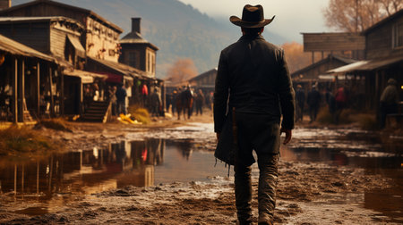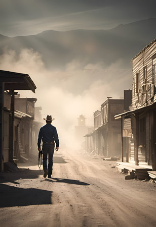 Cowboy stands in a dusty western town under a bright sky during the afternoon