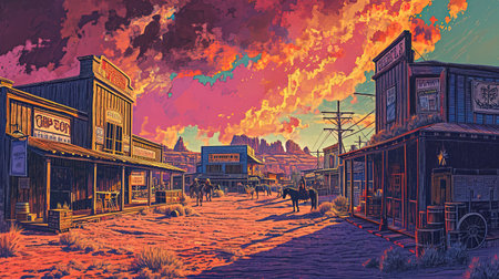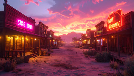 As the sun sets in a blaze of pink and orange over the distant mountains, an old western town comes alive with a modern twist. Glowing neon signs cast a vibrant, futuristic light onto the dusty main street, creating a surreal blend of past and future. This atmospheric scene evokes a sense of cinematic adventure and nostalgic futurism.