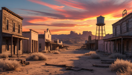 Deserted old west town under colorful sunset sky with dramatic clouds and distant mountains