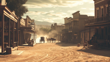 A captivating scene of a Western town at sunset, featuring horse-drawn carriages and vintage storefronts bathed in a dusty golden light. Resplendent.