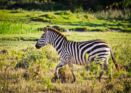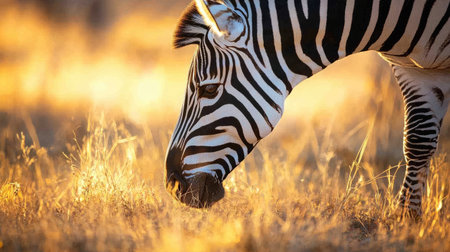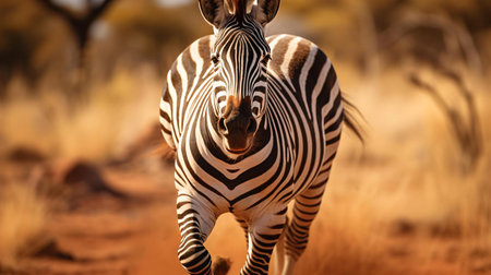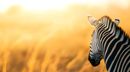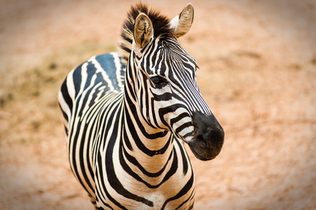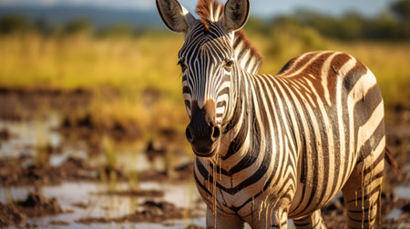 Portrait of plains zebra (Equus quagga), in the sun-drenched morning savannah. African herbivore - zebra in the day light.