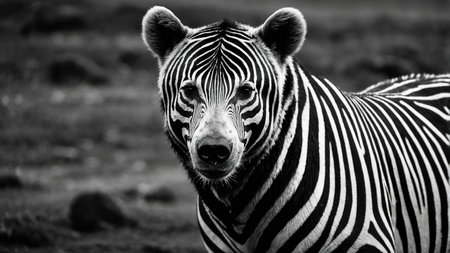 Bear with zebra-like stripes, blending elements of both animals, in a monochromatic, artistic style, highlighting imagination and creativity.
