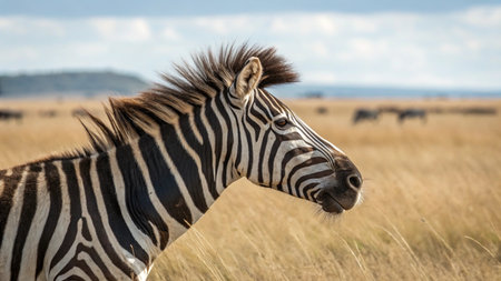 Zebra portrait on African savanna. Safari in Serengeti, Tanzania