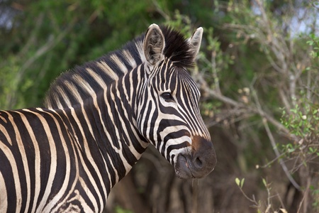 Single zebra head close-up, view on head and stripes, bush in defocused background