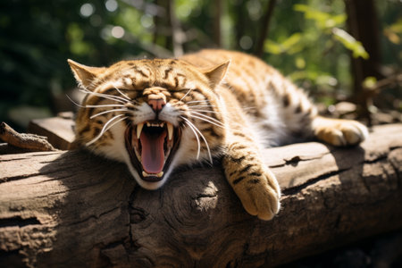 A bobcat yawning after waking up