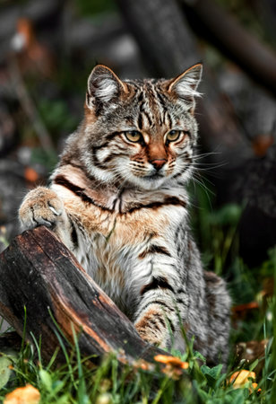 Small, adorable cat lying in the grass. A young bobcat follows its prey through the woods. stripes, pointy whiskers, and ears. trees, flowers, woodlands, and grass. animal controlled photo shoot with . Generative AI