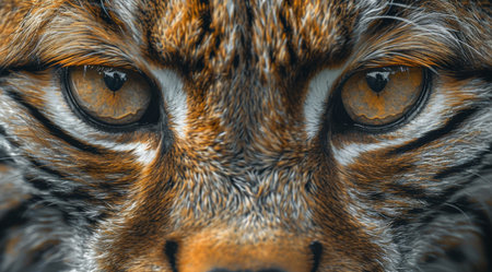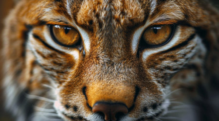 A close-up view of a lynxs face, showing its piercing amber eyes and black nose. The lynxs fur is a beautiful blend of brown and black.