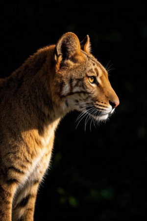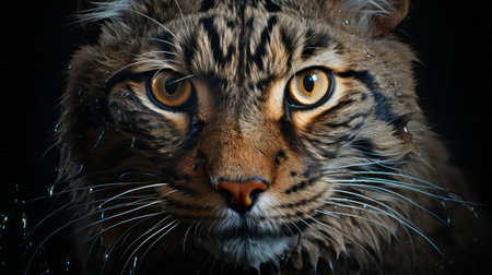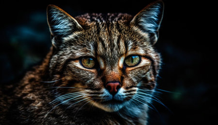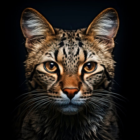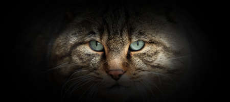 Wild cat portrait on a black background. View from the darkness