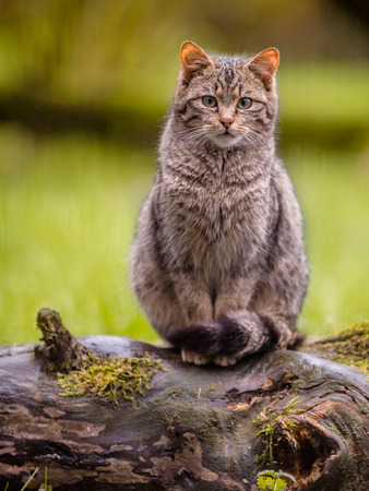 Shy european wildcat looking back over shoulder on a meadow in autumn
