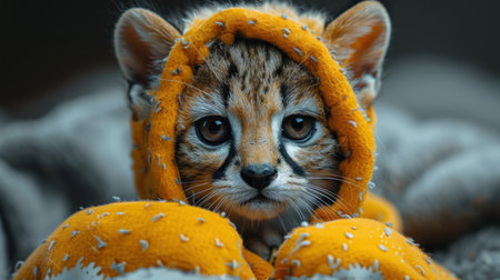 Cute little tiger cub in a hat and scarf. Animal portrait.