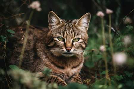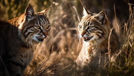 Wild feline beauty staring, hiding in natural grass generated by artificial intelligence