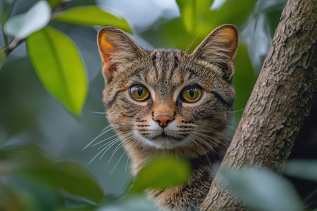 A wild cat with striking yellow eyes peers through green foliage resting on a tree branch in its natural habitat during daylight.