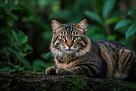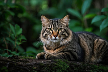 Striped cat lying down in the forest