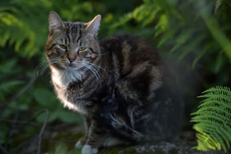 Beautiful pet cat on a background of fern.