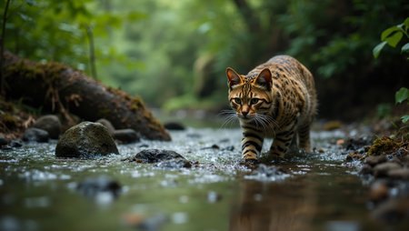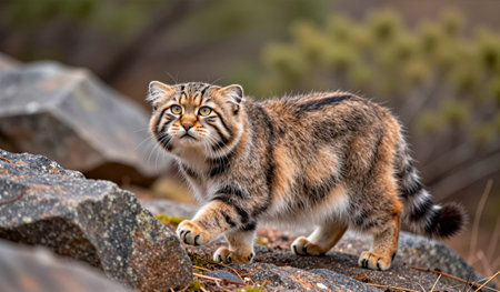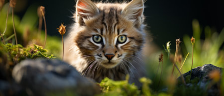 A wildcat wanders through a rugged landscape, its curious eyes scanning the surroundings. Soft sunlight gently illuminates the fur, creating a magical atmosphere in the early morning.