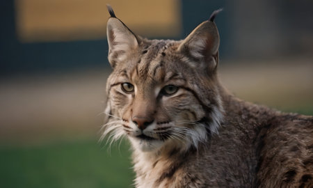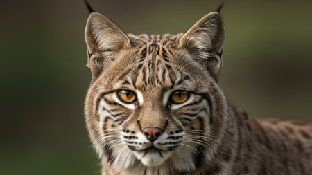 A detailed portrait showcases a bobcat with brown and black striped fur and piercing yellow eyes. The composition is a tight close-up, highlighting the animal's facial features against a blurred green background, possibly suggesting a natural outdoor setting. Suitable for various editorial and commercial projects.