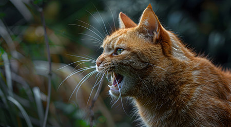 Portrait of a beautiful tabby cat yawning in the garden.