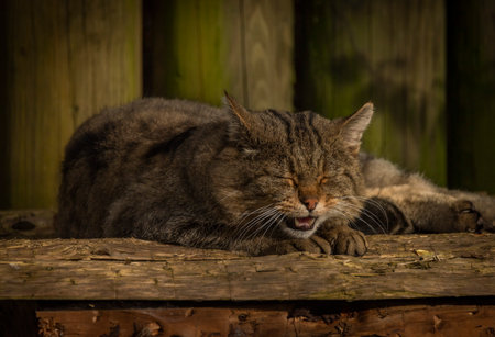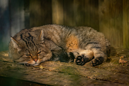 Wild cat lying on old wooden floor in autumn cloudy day