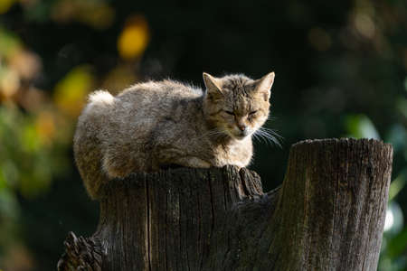 An European Wildcat - Felis silvestris silvestris - in a forest enjoying the sun in autumn