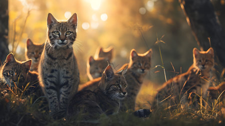 Wild cat family in the forest in the summer evening with setting sun. Group of wild animals in nature.