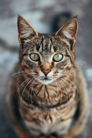Close up portrait of tabby cat with green eyes looking at camera