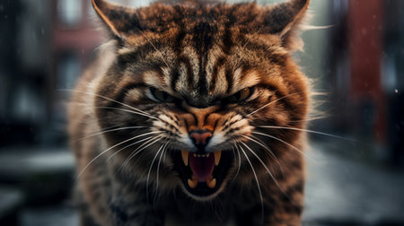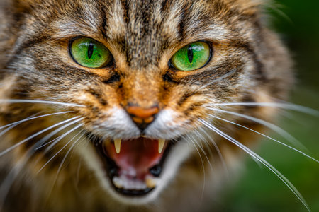 An intense closeup of a growling cat with bared teeth, displaying a formidable and fierce demeanor