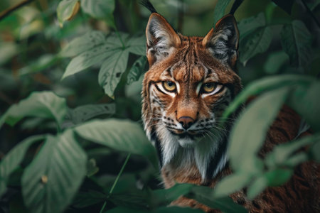Playful baby lynx emerging from a lush forest, its gaze captivating amidst vibrant leaves.