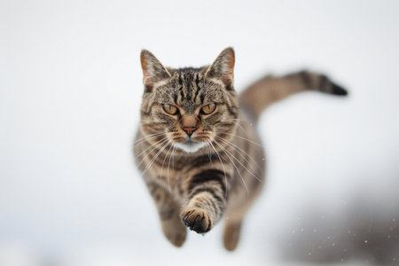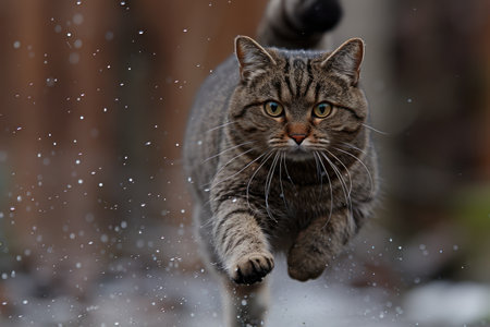 Funny tabby cat running in the snow. Shallow depth of field.