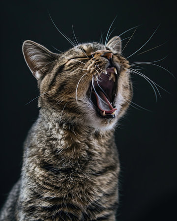 Portrait of a yawning tabby cat on a black background
