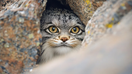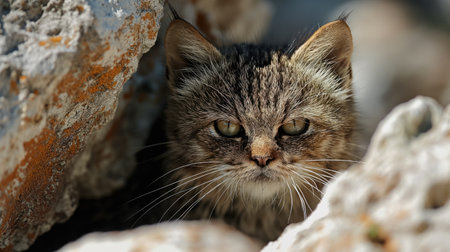 A cautious cat with striking green eyes peeks out from the safety of a rocky crevice, blending into its surroundings.