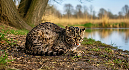 Wild cat sitting on the ground near the lake in the nature.
