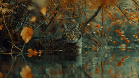 A cat sitting in a pond surrounded by leaves and trees, AI