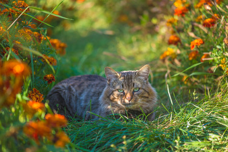 Domestic cat in a meadow with orange flowers in summer.