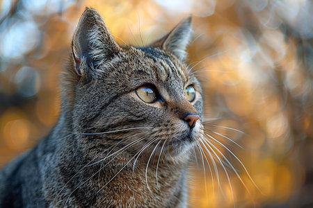 Close-up portrait of a European Shorthair cat in autumn