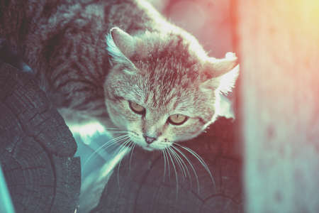 Portrait of a cat outdoors in spring. The cat lying on logs in the yard on a sunny day