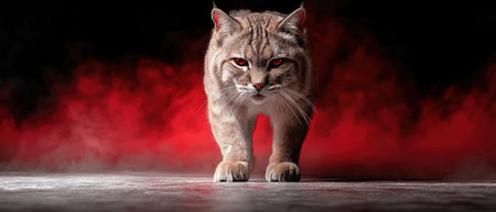 A bobcat with glowing red eyes walks towards the camera in a red smoky background