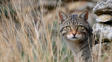 European wildcat partially hidden by dry grass near a stone wall looking around