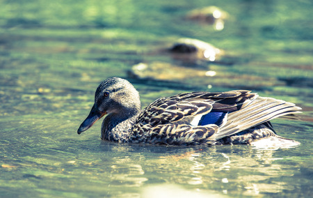 Wild nature, duck on the water, life river, toned