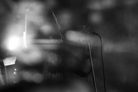 Spots of light with copy space against female drummer playing drums. music festival and concert concept