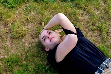 Young woman with very short hair lies in the green grass, arms on the neck and head