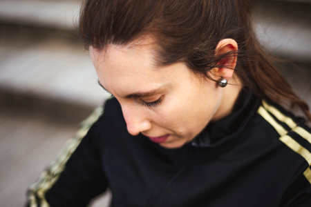 Portrait of young woman in white sportswear behind wood stairs at park.