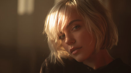 A young woman with short blonde hair posing against a sunlit wall, capturing a serene moment in an indoor setting