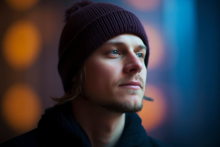 Handsome young man in winter hat looking away and smiling.