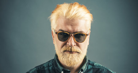 Portrait of satisfied businessman against grey wall. Close-up portrait of serious man model with mustaches and beard in shirt.