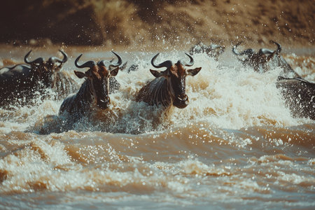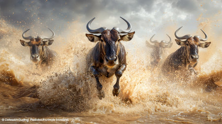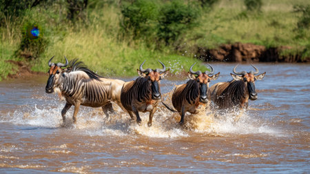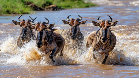 A dynamic scene featuring four wildebeests splashing through a river in their natural habitat, capturing the essence of wildlife movement and beauty.