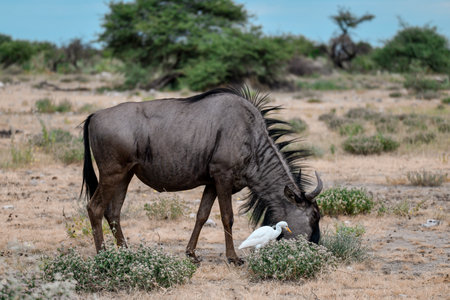 Blue wildebeest grazes in the grassy plains near the Okaukeujo Camp in Etosha National Park, Namibia.