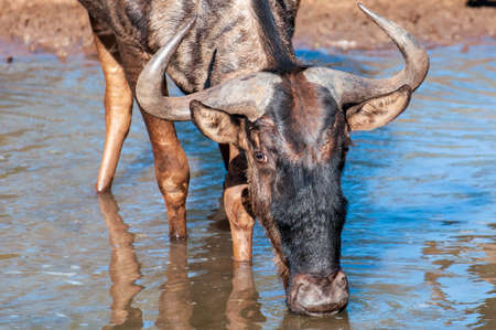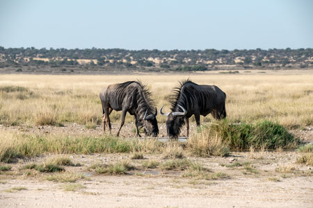 wild Blue Wildebeest Gnu drinking from waterhole in Etosha, Namibia Africa wildlife safari. This is typical african scenery