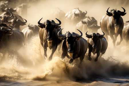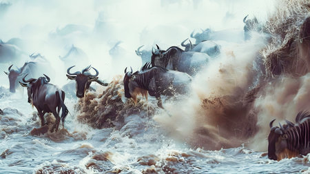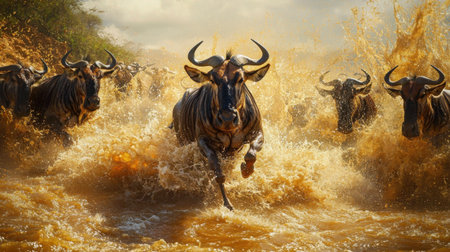 A dynamic scene showcasing a herd of wildebeests charging through water during their migration. The image captures the energy and excitement of wildlife in their natural habitat.
