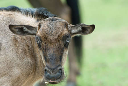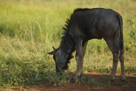A blue wildebeest (Connochaetes taurinus) baby calmly feeding in wet green grassland. Evening sun. Green background.