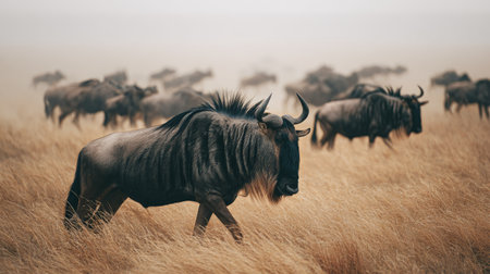 Blue wildebeest (Connochaetes taurinus) herd in misty morning